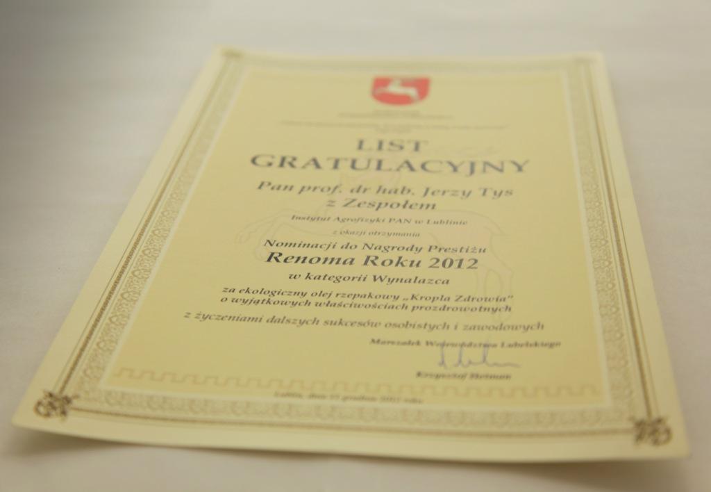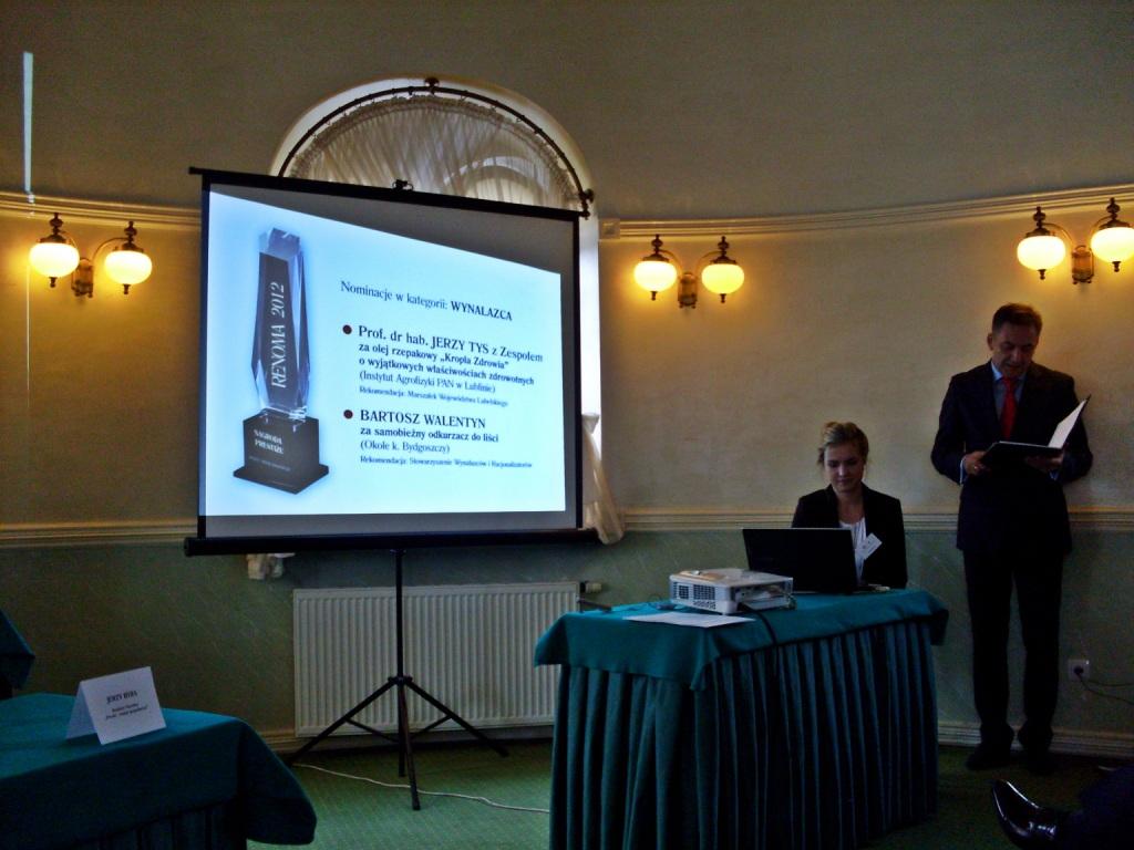 In the "Inventor" category the Prestiż Award "Renown of the Year 2012 Edition" went to Prof. DSc Jerzy Tys and his team from the Institute of Agrophysics Polish Academy of Sciences in Lublin for ecological rape oil Kropla Zdrowia.